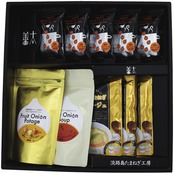商品内容:淡路島朝のオニオンスープ個食(7.9g)×5、金のたまねぎポタージュ(150g)×3、ZENTAの金のポタージュ(18.7g×3袋)・淡路島フルーツ玉ねぎスープ(6.2g×5袋)×各1