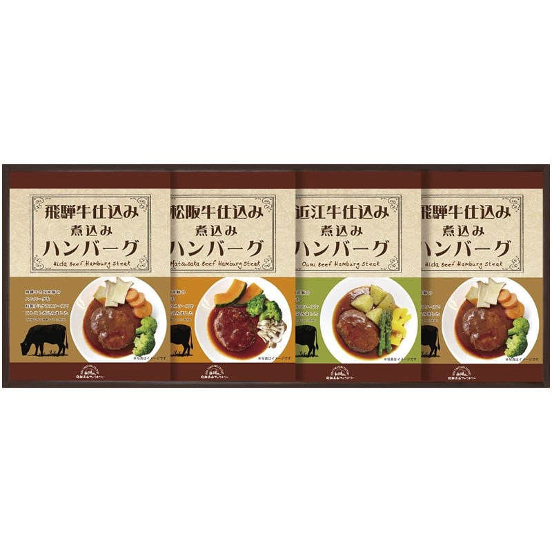 商品内容:飛騨牛仕込みハンバーグ(150g)×2、松阪牛仕込みハンバーグ・近江牛仕込みハンバーグ(各150g)×各1