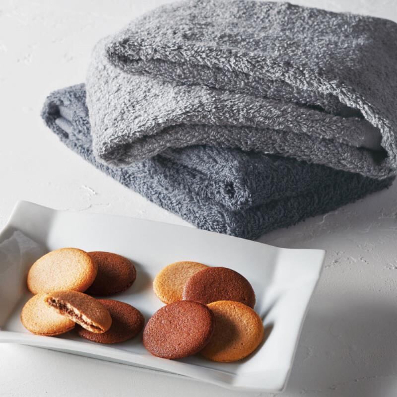 軽やかなラングドシャ生地で、チョコレートをサンドしたクッキー。「ミルクチョコレート」と「ダークチョコレート」、2種類のクッキーの詰め合わせと、柔らかな肌さわりとシルクの様な滑らかさでふんわり感が続くフェイスタオルのセットです。