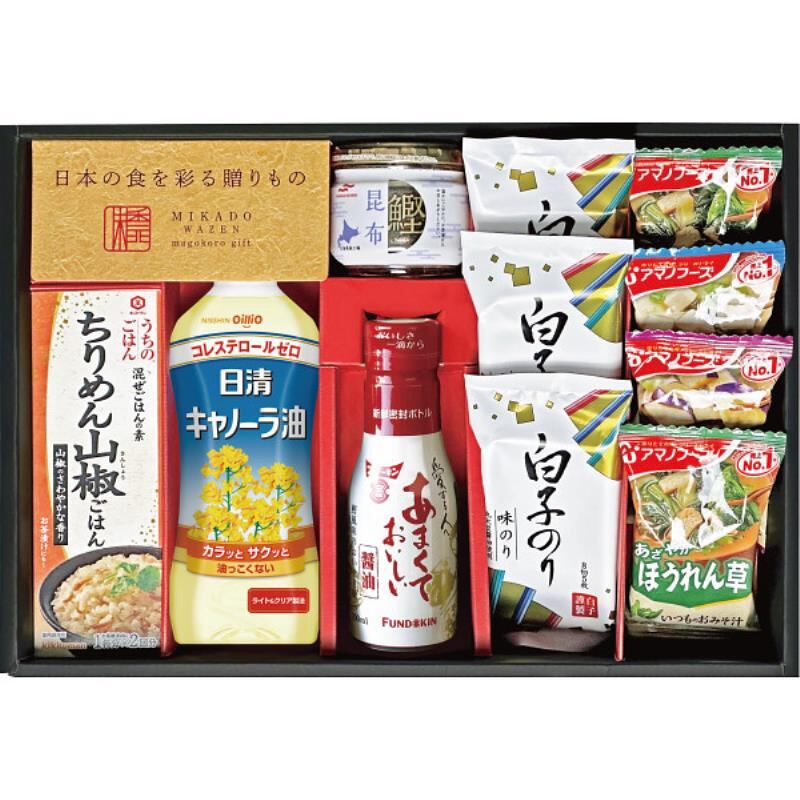 商品内容:●フンドーキンあまくておいしい醤油200ml、キッコーマン混ぜごはんの素ちりめん山椒(27g×2)、アマノフーズフリーズドライいつものおみそ汁(ほうれん草×2、なす・とうふ×各1)、日清キャノーラ油350g、白子のり(8切5枚)×3、マルハニチロ鰹昆布45g