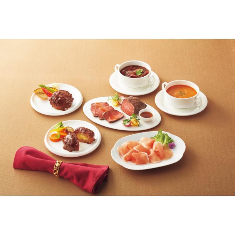 商品内容:●ローストビーフ(もも)200g、ローストポーク160g、トリュフ入りグレイビーソース30g、生ハムスライス45g、ビーフシチュー180g、オマール海老のビスク150g、デミグラスソースハンバーグ(牛肉・豚肉使用)・デミグラスソースチーズ入りハンバーグ(牛肉・豚肉使用)各120g×各2