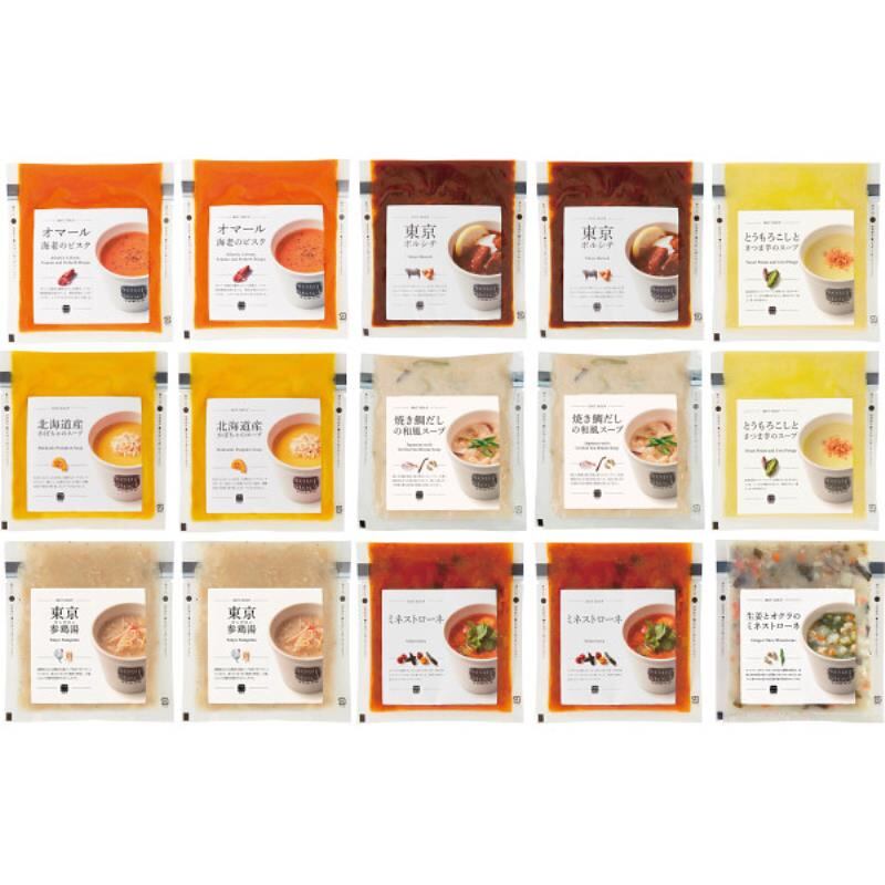 商品内容:●オマール海老のビスク・東京ボルシチ・とうもろこしとさつま芋のスープ・東京参鶏湯・焼き鯛だしの和風スープ・ミネストローネ・北海道産かぼちゃのスープ各180g×2、生姜とオクラのミネストローネ180g×1(計8種15パック)