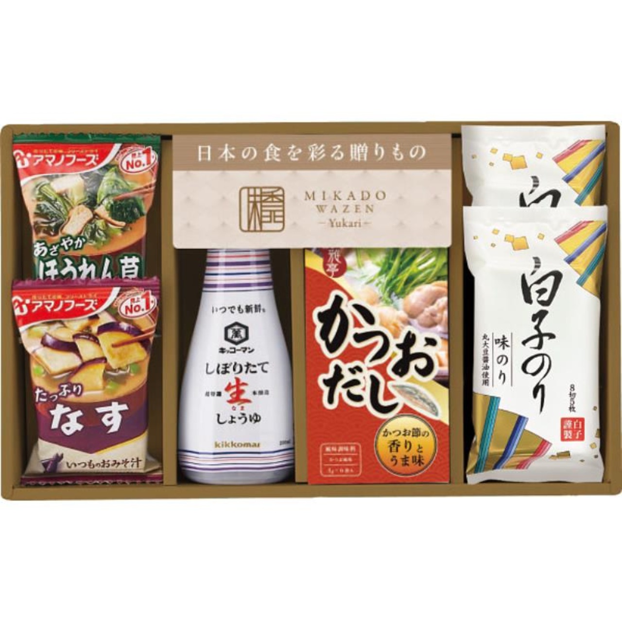 商品内容:●キッコーマンいつでも新鮮しぼりたて生しょうゆ200ml、白子のり味のり(8切5枚)×2、メイワかつおだし(4g×6)、アマノフーズフリーズドライいつものおみそ汁(なす・ほうれん草)×各1
