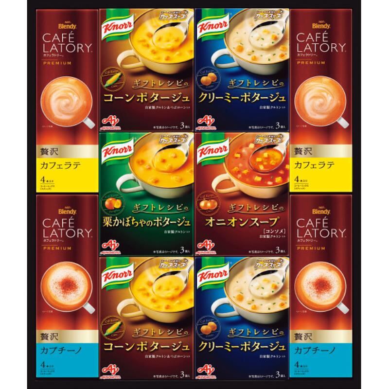 商品内容:●(粉タイプ)ギフトレシピのコーンポタージュ(19g)3P×2、ギフトレシピのクリーミーポタージュ(16.6g)3P×2、ギフトレシピのオニオンスープ(13.1g)3P×1、ギフトレシピの栗かぼちゃのポタージュ(18.7g)3P×1、スティックプレミアム贅沢カフェラテ(18g)4P×2、スティックプレミアム贅沢カプチーノ(18g)4P×2