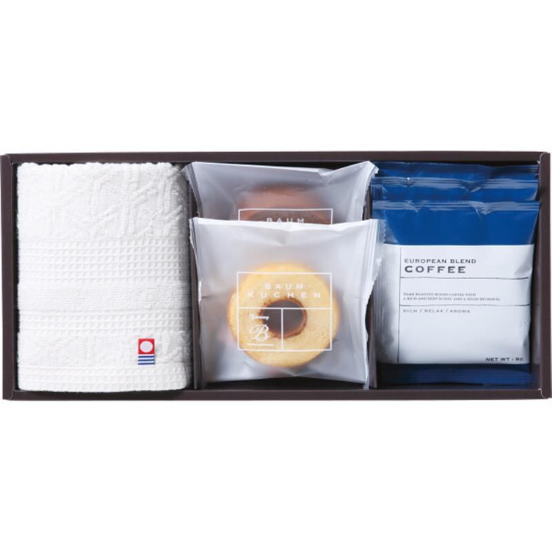 商品内容:●今治産ウォッシュタオル(約34×35cm・綿100%・日本製)1枚・ミニバウム(バニラ×1・チョコ×1)・ドリップコーヒー8g×3