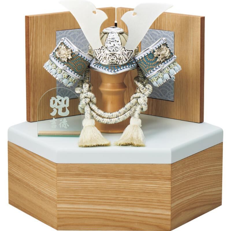 晴れ渡る五月の空を思わせる、明るい木目調の兜収納飾りです。