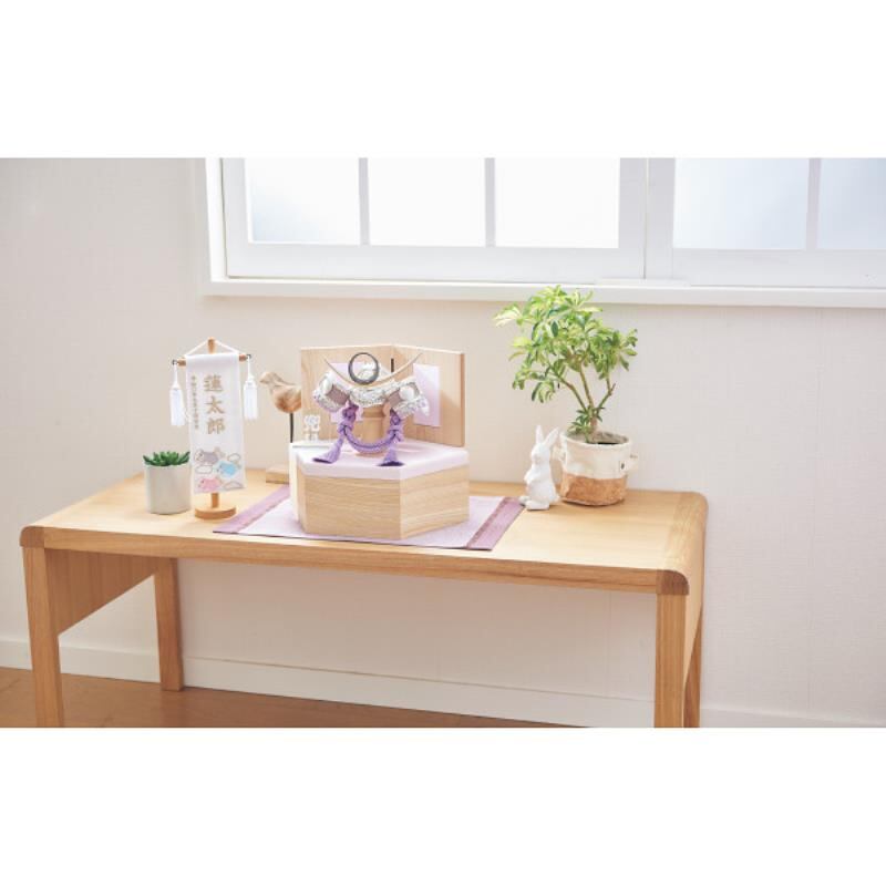 明るい木目調の収納箱に、藤色の忍び緒が目を引く兜をあわせました。