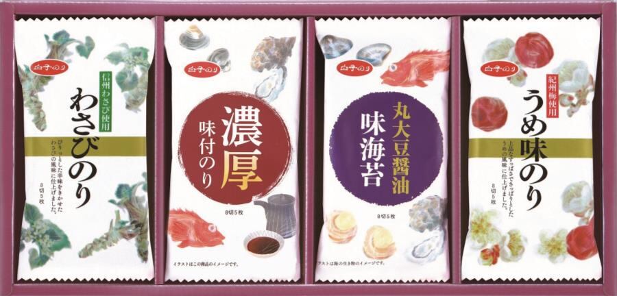 商品内容:信州わさび使用わさびのり(8切5枚)×2、濃厚味付のり(8切5枚)×2、丸大豆醤油味のり(8切5枚)×2、紀州梅使用うめ味のり(8切5枚)×2