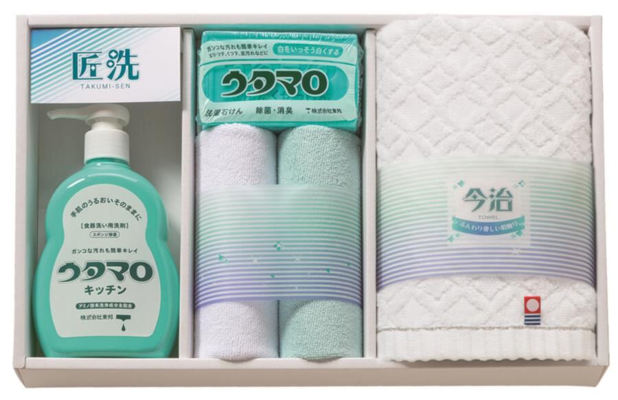 商品内容:ウタマロ洗濯石けん(133g)×1、ウタマロキッチン(300ml)×1、ウォッシュタオル(28×30㎝)×1、マイクロファイバークロス(25×25㎝)×2