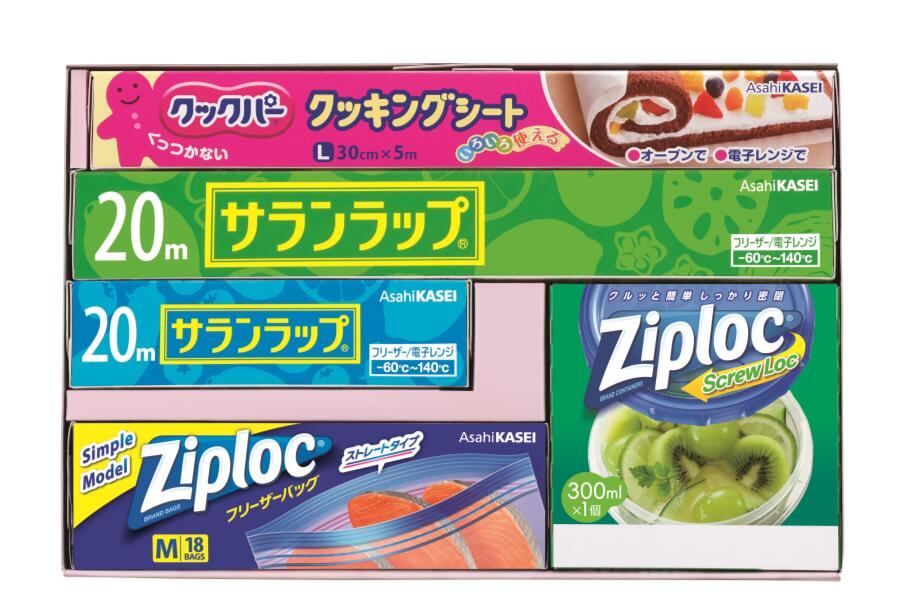 商品内容:サランラップ(30cm×20m)×1、サランラップ(15cm×20m)×1、ジップロックフリザーバッグ(M18枚入)×1、ジップロックスクリューロック(300ml1個入)×1、クックパークッキングシート(Lサイズ30cm×5m)×1