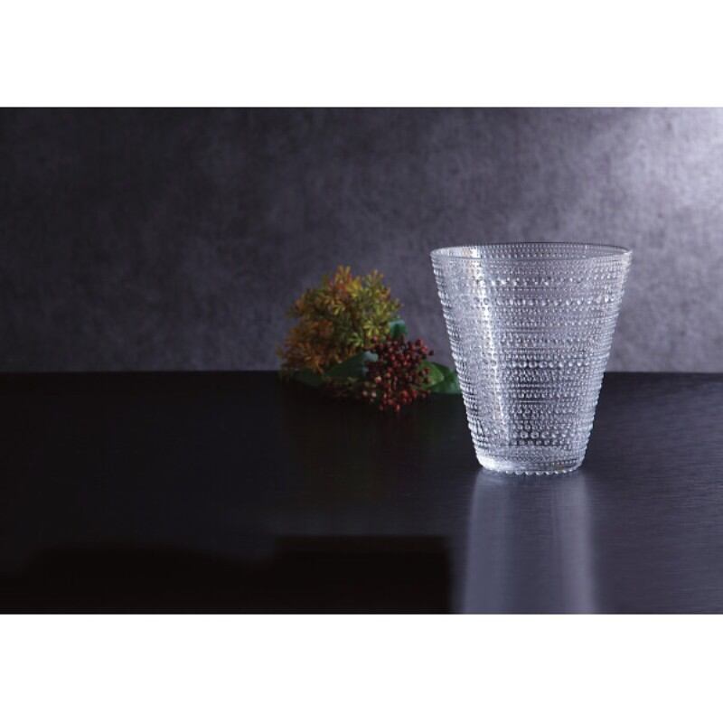 カステヘルミはフィンランド語で「露のしずく」という意味。朝日を浴びて、まるで連なる真珠のようにきらめく朝露にインスピレーションを得てデザインされました。1964年にオイバ・トイッカがデザインし、2010年にリニューアルされています。全体にあしらわれた連なるガラスのしずくのようなデコレーションは、輝くガラスの美しさを際立たせています。