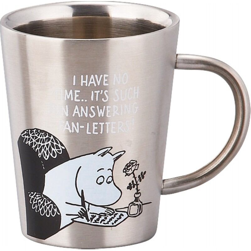 二重構造で保温、保冷に優れたステンレス製マグ。背面に入っているムーミンがファンレターの返事を書いている可愛いデザインです。