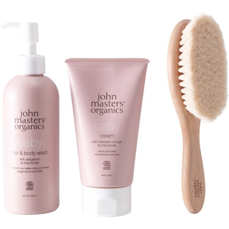 ベビーの肌を潤いで守りながら洗うことにこだわり、潤いたっぷりのアロエベラ液汁をベースに保湿成分のトレハロースなどを配合した〈B&Cべビーヘア&ボディウォッシュ〉と、やわらかくて伸びがよく、ベビーの繊細な肌にもストレスを与えずに塗ることができる〈M&Cベビークリーム〉、トウモロコシ由来のポリエステルで作られた生分解性のある人工毛と、なめらかなブナの天然木でできた〈ベビーヘアブラシ〉の3点セット。