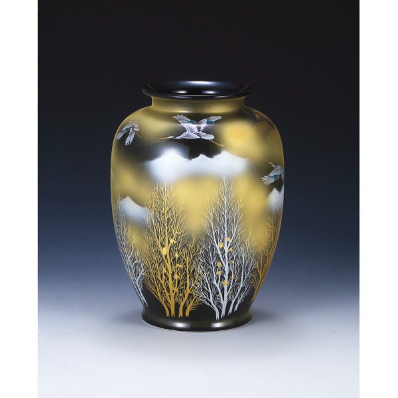 幻想的な仕上がりが特徴の「吹き付け技法」により連山と雲海を描き、その中を舞い飛ぶ群鶴を絵付けした大変縁起の良い花瓶です。。季節や場所を問わず、お楽しみいただけます。