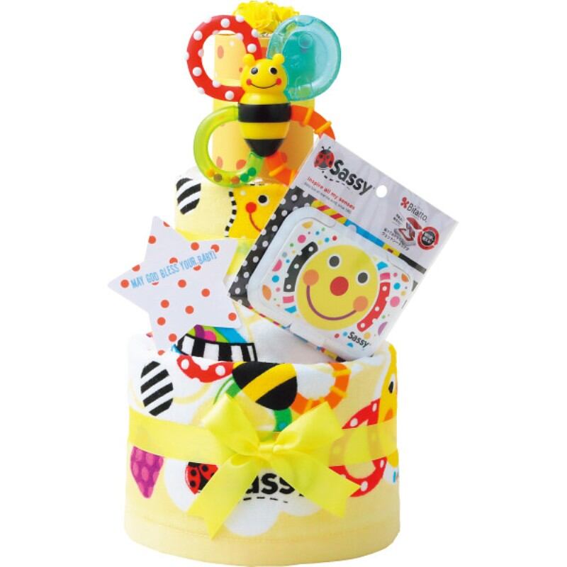 大人気ブランドSassyで組み立てられたおむつケーキ。全て無駄がなく捨てるところがない贈り物です。