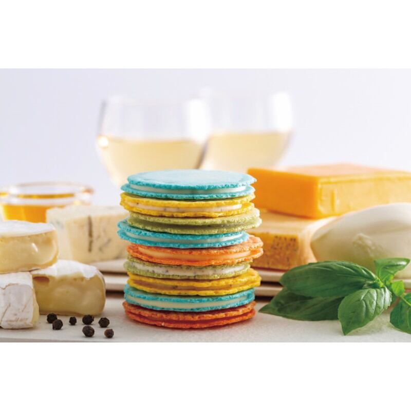 4種のチーズをサクサクでカラフルな海老煎餅でサンドしました。例えばモッツァレラとバジル、ブルーチーズと蜂蜜はイタリア料理でおなじみのコンビ。お気に入りのワインのおともに、またパーティやお茶会など様々なシーンでお楽しみいただけます。